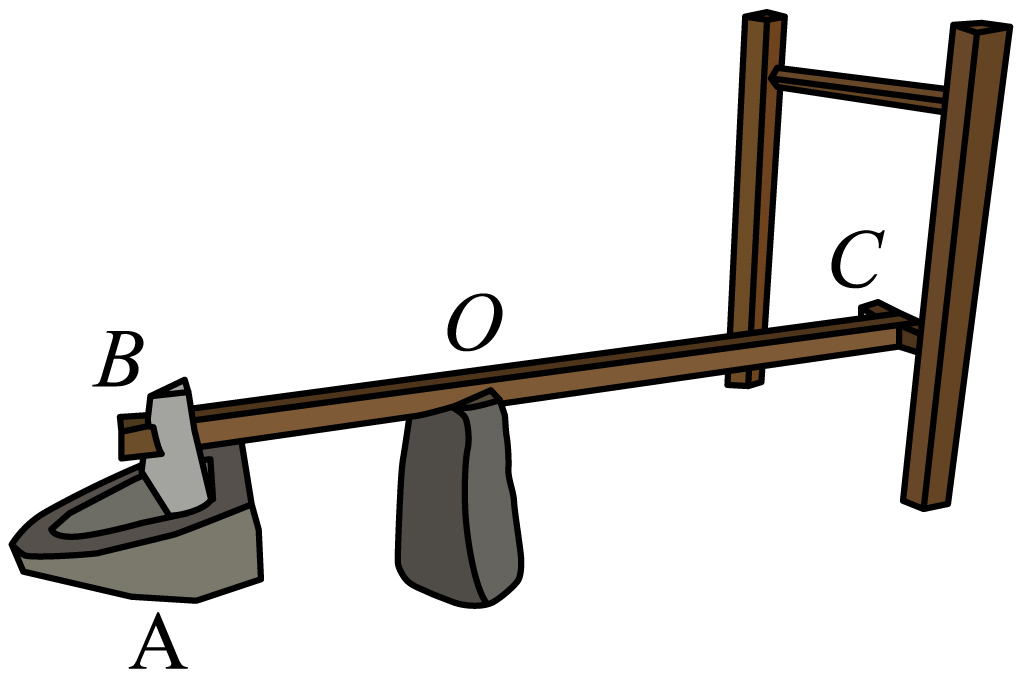 点往下压时,舂米锤便向上抬起。然后提起脚,舂米锤就向下运动,击打