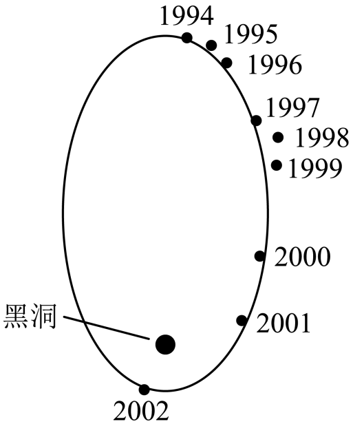 科学家对银河系中心附近的恒星S2进行了多年的持续观测,给出1994年到2002年间S2的位置如图所示。科学家认为S2的运动轨迹是半长轴约为