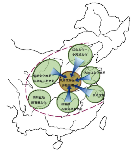 ![]() | 公元前3000至2500年文化格局示意图(注解:1红山文化-小河沿文化(牛河梁遗址群位置)2仰韶文化晚期-庙底沟二期文化(大地湾遗址位置)3四川盆地新石器文化4屈家岭-石家河早期文化(石家河遗址群位置)5良渚文化(良渚遗址群位置)6大汶口文化晚期(大汶口遗址位置)7中原文化区开始出现) |