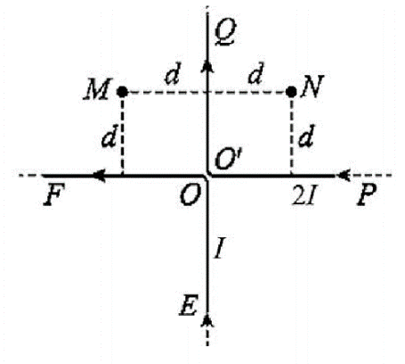 两足够长直导线均折成直角,按图示方式放置在同一平面内,