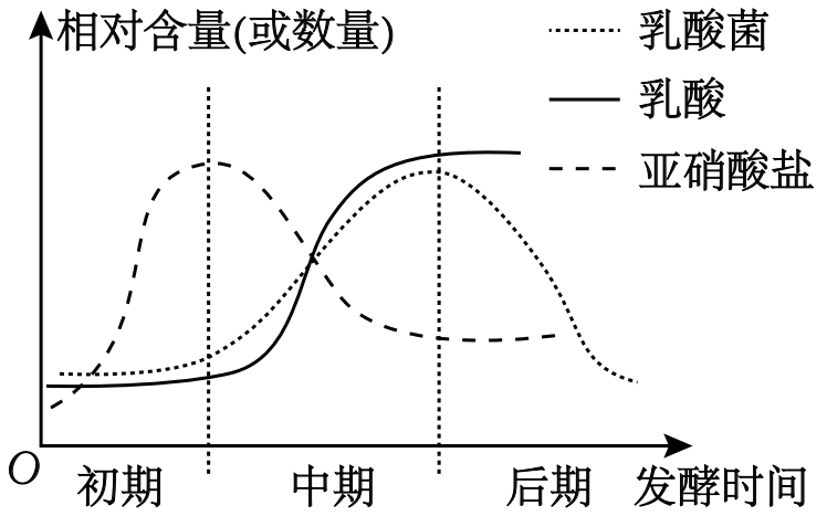 | A.发酵初期,亚硝酸盐含量升高,主要是由于硝酸盐还原菌大量繁殖 |