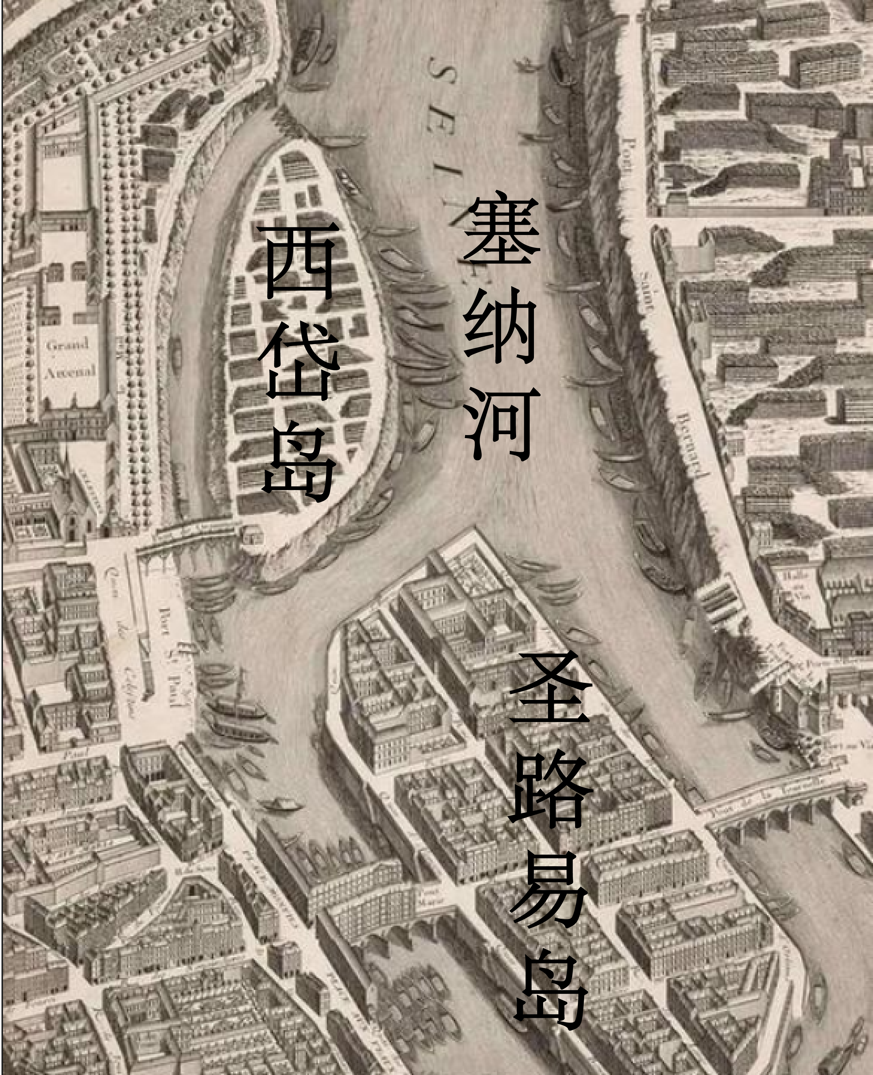 西岱岛(圈)是镶嵌在塞纳河中央的一个小岛,也是巴黎城区的发源地,著名的巴黎圣母院位于该岛。圣路易岛(图)是在17世纪人工填埋河道、连接一些较小的岛屿和浅滩而形成的,形状比较规则。据此完成下面小题。