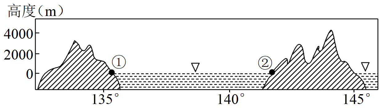 下图为沿45°N纬线局部剖面示意图,其中②地区冬季降雪丰富,有“世界豪雪”地带之称。读图,完成下面小题。