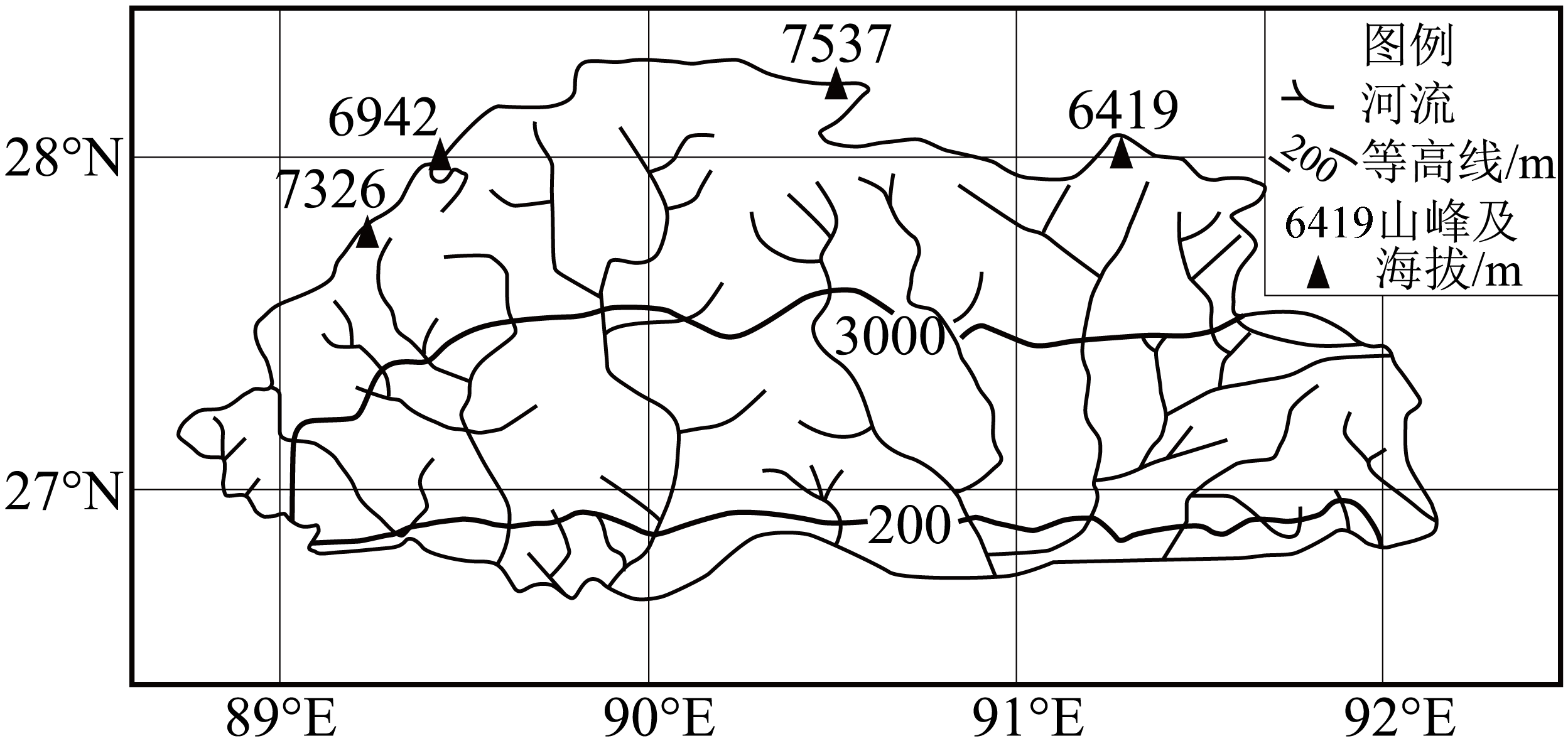 不丹是位于中国和印度之间喜马拉雅山脉东段南坡的内陆国,该国森林覆盖率高达72%,有“森林之国”的美称。有些山体一半冰雪、一半森林,中间无过渡。该国水能资源极为丰富,但开发利用率很低。读不丹地形图,据此完成下面小题。