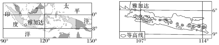 雅加达是印度尼西亚首都,市区人口1200万,所在的爪哇岛人口约占全国的60%。雅加达地势南高北低,地势低洼。2019年8月26日,印度尼西亚总统正式宣布迁都计划,新首都选址位于加里曼丹岛东部。下图为“印度尼西亚简图”和“爪哇岛等高线地形图”。据此完成下面小题。