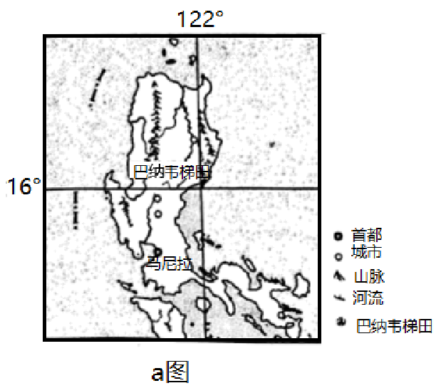 距今有200年历史的菲律宾巴纳韦梯田,以气势磅礴和陡峭的坡度而著称,1905年被列入世界文化遗户名来为这应当地自然环境。梯田提坝多用石块砌成,纵贯在梯田间的主渠,往往修得大而宽。随着社会经济的发展,巴纳韦梯田却陷入“濒危”的困境。图a示意巴纳韦梯田地理位置,图b为巴纳韦梯田景观。据此完成下面小题。