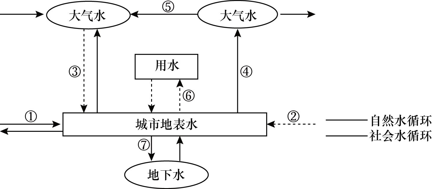 水循环既发生在自然界,也发生在人类社会中。在自然水循环的大框架内形成并发展了人工水循环(社会水循环)。下图示意某城市自然水循环和社会水循环。图中序号表示水循环环节。据此完成下面小题。