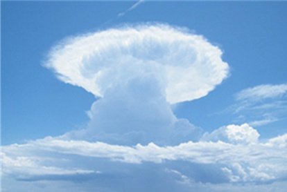 2023年8月新疆塔城惊现“蘑菇云”,引起人们极大关注。事实上这是夏日限定“砧状云”,强烈上升的水汽形成高大的云山,其顶部遇到阻力向四周散开,其白色透光的边缘是由冰晶组成,也预示着暴风雨的前来。下图示意“砧状云”景观图,完成下面小题。