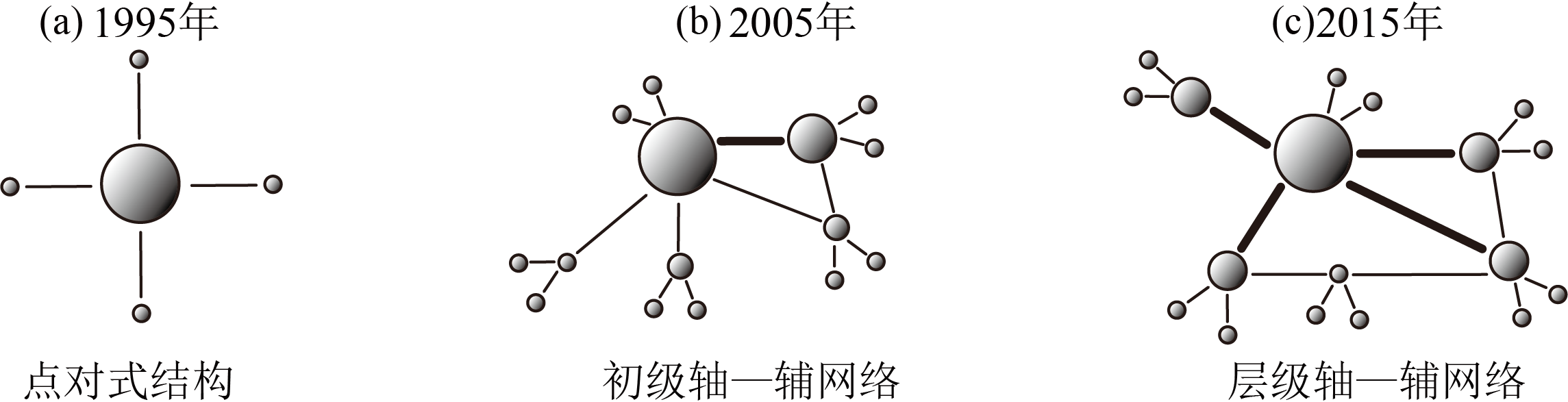 伴随着我国新型城镇化的不断推进,区域发展的竞争已经由个体城市的竞争演化为区域内多个群体综合实力的竞争。下图示意以武汉主城区为轴心,以部分地级城市主城区为二级轴心,其他城镇为辐点的武汉的城市圈轴-辐网络结构1995~2015年的动态变化过程。据此完成下面小题。