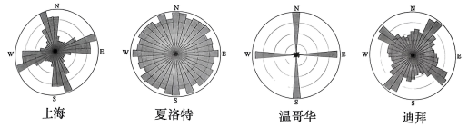 如图为四个大城市的街道方向玫瑰图。不同方向的长度,代表该方向街道出现的相对频率。据此完成下面小题。