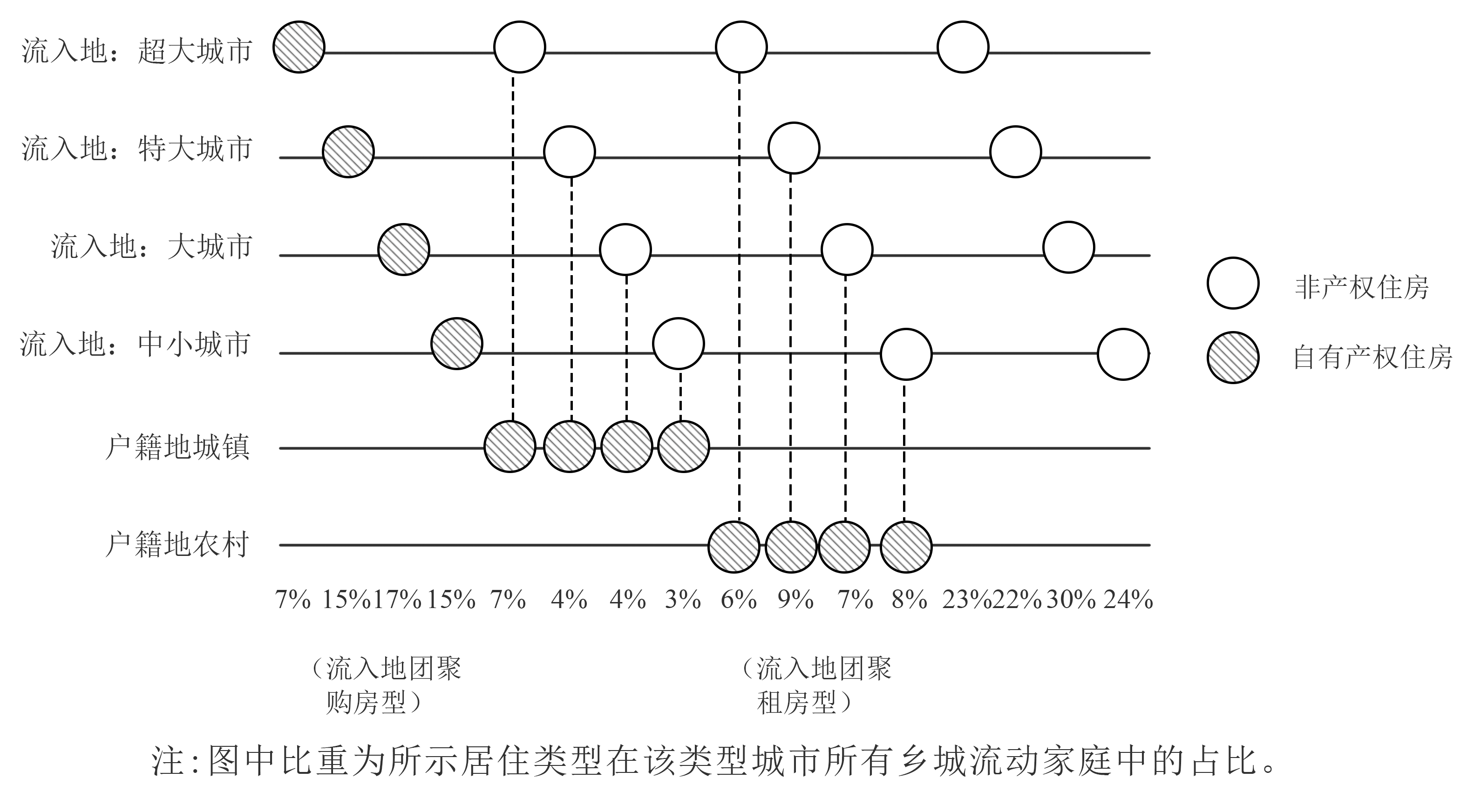 基于2016年中国流动人口动态监测调查,研究人员得出乡城流动家庭住房区位和权属情况,并由此分出四种家庭居住模式。下图为流入地城市等级与乡城流动家庭的居住模式。完成下面小题。