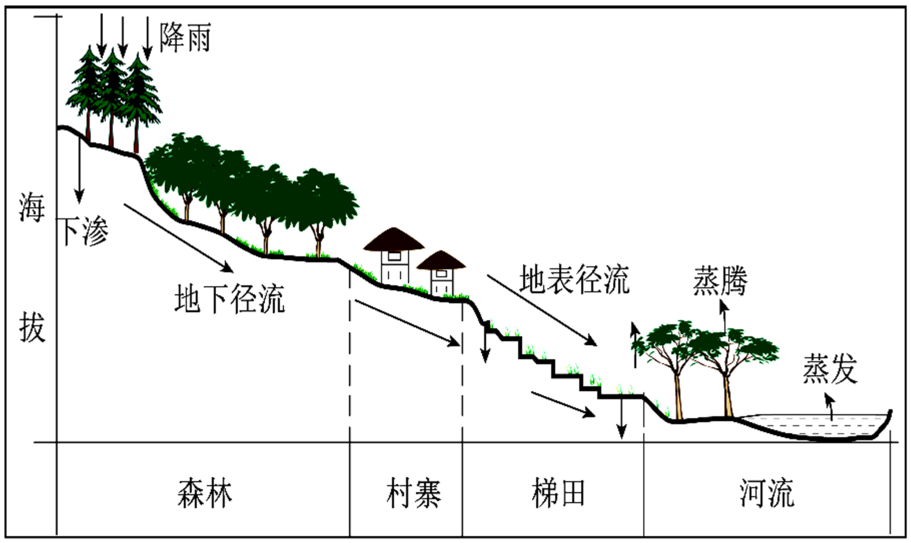 红河哈尼梯田位于云南东南部,地处横断山区,水旱灾害频发。为适应当地特殊的地理环境,该地形成了“山—林—寨—田—水”空间格局,体现了人与自然的和谐共生理念。图示意哈尼梯田地理位置和村寨空间格局。完成下面小题。