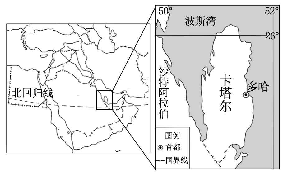 卡塔尔是亚洲西南部的阿拉伯国家,地处波斯湾沿岸,海岸线长563千米,总面积为11521 平方米,目前周边国家大量人到卡塔尔务工。下图为卡塔尔简图。完成下面小题。