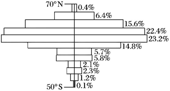 目前,全球80多亿人口主要分布在70°N至50°S地区,下图为纬度每隔10°范围内分布的人口占全球人口的比重。读图,回答下面小题。