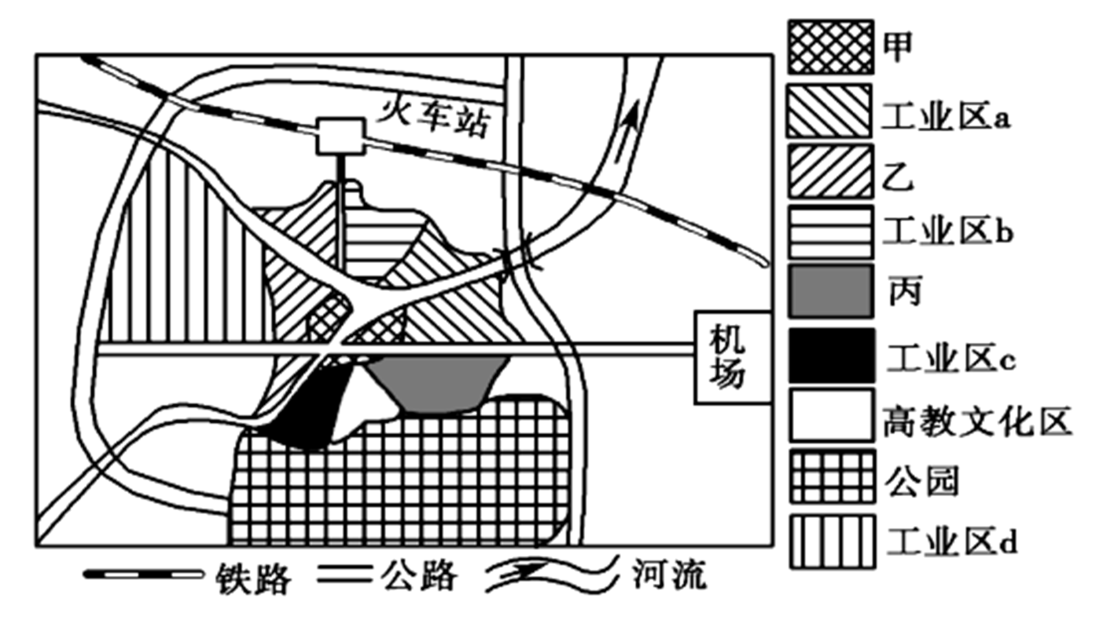 | A.甲大型的批发市场 | B.乙为市政用地 | C.丙高级住宅区 | D.乙为绿化带 |