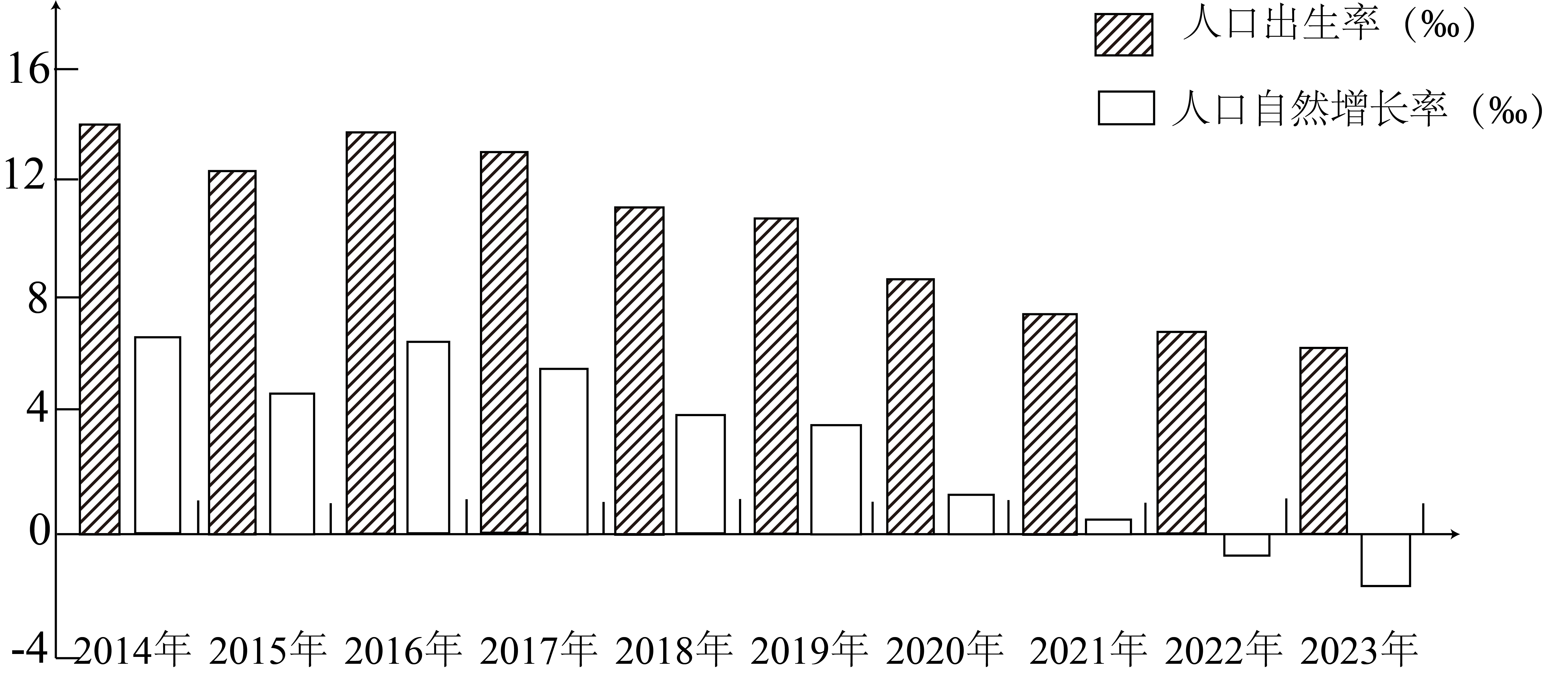我国延迟退休改革将从2025年1月1日起启动,逐步将男职工的法定退休年龄从原60周岁延迟至63周岁,将女职工的法定退休年龄从原50周岁、55周岁分别延迟至55周岁、58周岁。如图示意我国2014~2023年人口出生率和自然增长率的变化。据此完成下面小题。