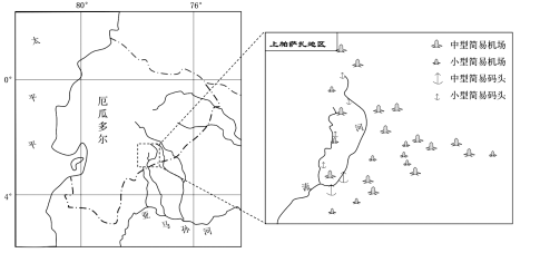 上帕萨扎地区地处厄瓜多尔东南部,雨林密布,人口较多但聚落分布较分散。下图示意该地区位置及主要交通设施分布。完成下面小题。