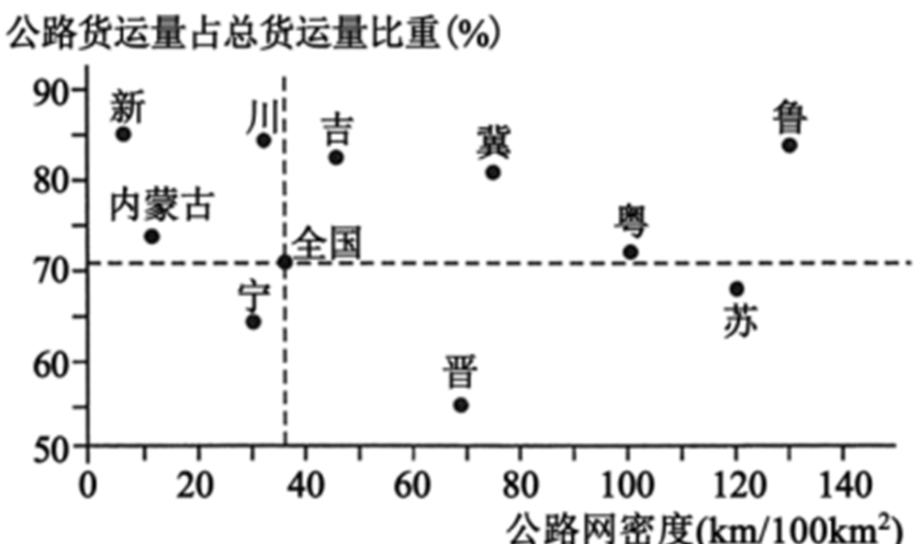 下图为我国部分省区的公路网密度和公路货运量占总货运量比重图。据此完成下面小题。