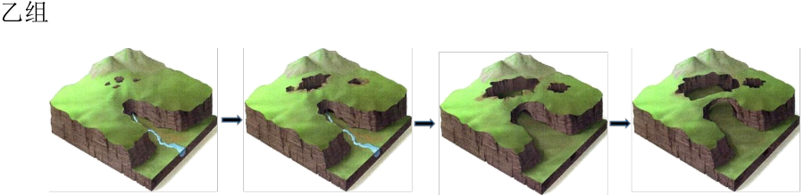 穿洞一词原本是喀斯特术语,后来这一概念也被引入其他地貌之中,只要两端成开口状透光的洞穴就可以被称为穿洞。一般情况下,天生桥是穿洞的后续发展形态,所以也可以把天生桥视为一种特殊的穿洞。甲乙两组图分别是在两种岩石上发育的天生桥形成过程示意图,完成下面小题。