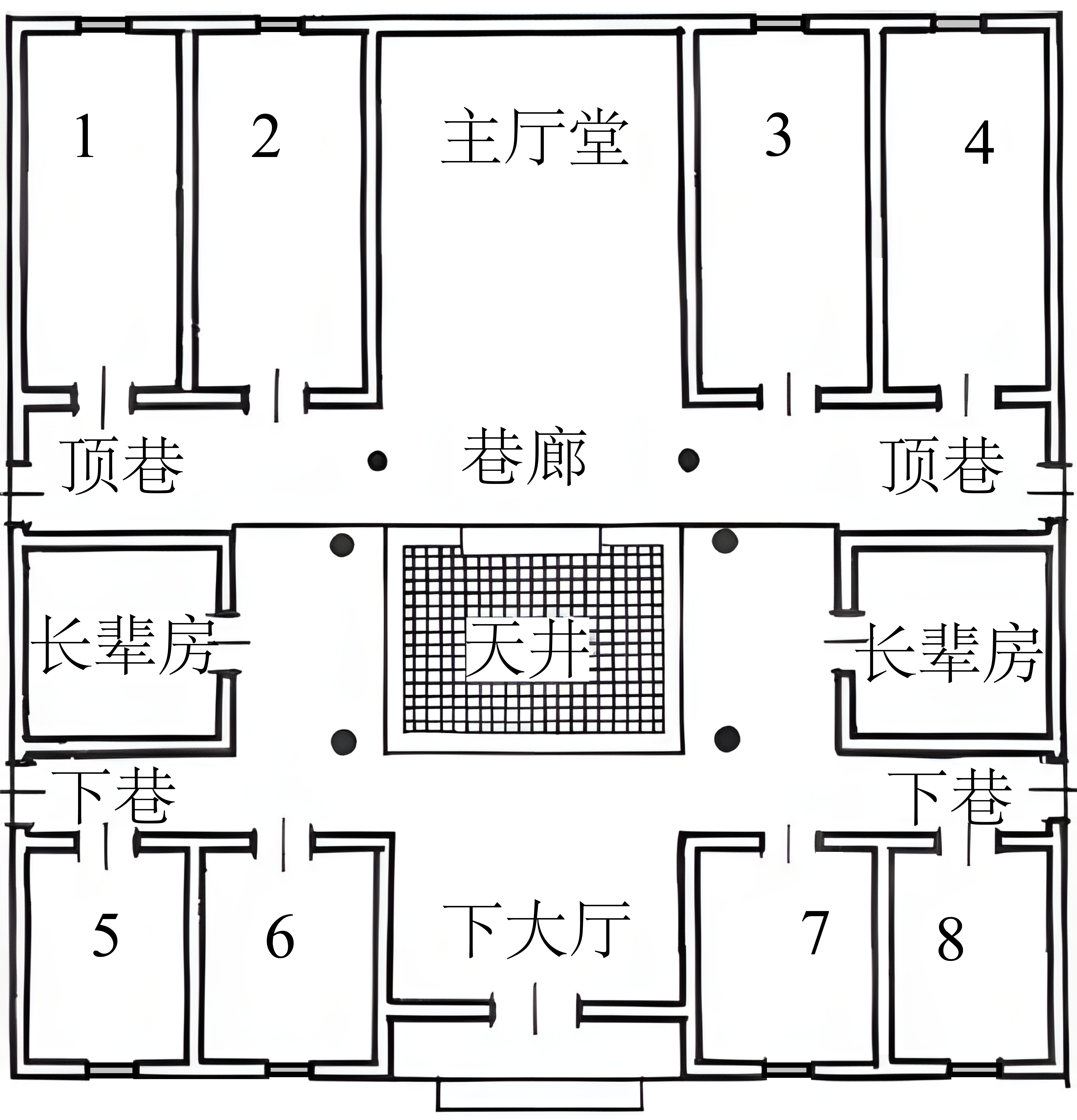 四合院是我国传统的民居形式,南北地区都有。四合院建筑布局深受传统文化中的方位尊卑观(重要性依次降低排序:中心高于四周、北高于南、东高于西)的影响。闽南有一大户人家都住在四合院里(见下图),祖父母、父母住长辈房,8个儿子各住一间房。完成下面小题。