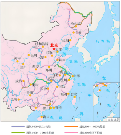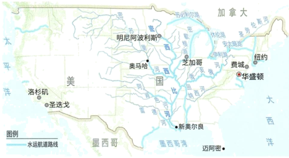 工业文明是从东部地中海开始,以波浪形态四散传播。因地理的约束,大致形成了从东向西以波浪形态转移。从欧洲越过大西洋传递到美洲,再越过太平洋传递到亚洲,目前波峰处于东亚位置。不同交通工具技术细节上的差异,以及工业文明不同货物的技术和价值特点,决定了工业文明的交通系统必须具有层次性。中国在铁路和公路充分发展之后,重新认识了水运的价值,重振中国内河航运的规划频频出台。读中美两国内河水运图,完成下面小题。
