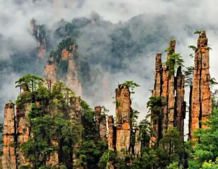 峰林是指在基岩上发育形成的聚峰成林的景观,湖南是我国峰林景观最丰富的省区之一,武陵源峰林的发育时间可以追溯到3.8亿年前,经历了多个地质时期的演变,最终形成了现在的地貌。其柱体高耸、柱体密度大、形态独特,被中国国家地理评选为5大最美峰林之一。下图为两种峰林景观图,读图完成下面小题。
