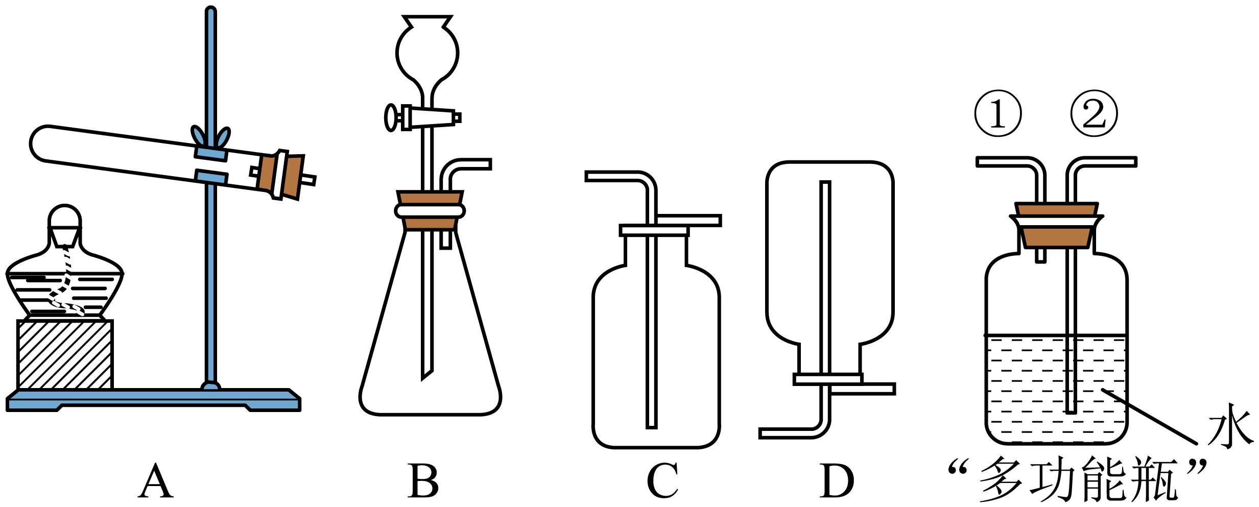 ______(选填字母A~D)。也可用图中的“多功能瓶”(实验前瓶中装有一半体积的水)收集氢气,氢气是从