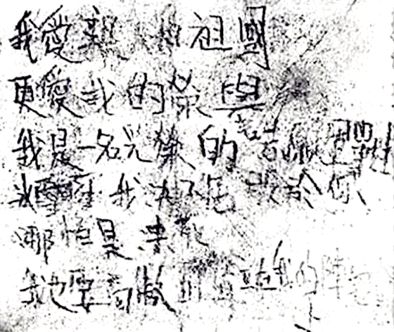 我爱亲人和祖国 更爱我的荣誉 我是一名光荣的志愿者战士 冰雪啊,我决不屈服于你 哪怕是冻死 我也要高傲的耸立在我的阵地上 |