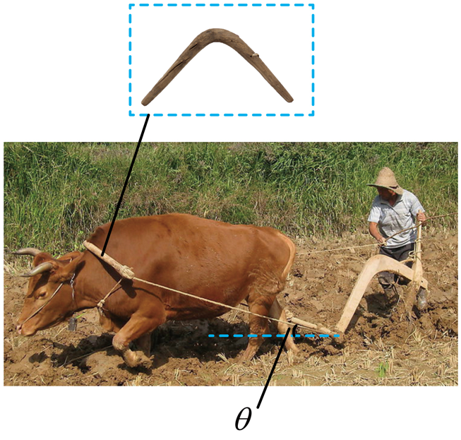 ,手轻扶犁保持前进方向,当犁水平匀速耕地时,绳子中的张力大小为