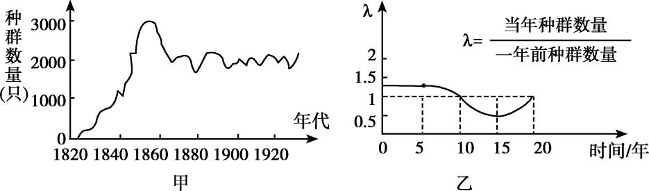 | D.图乙第15年时种群数量最少,可相当于图甲1880年的种群数量 |