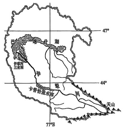 伊犁河下游地势低洼,洪水期河水泛滥塑造了广阔的三角洲洼地。1970年,伊犁河上修建卡普恰盖水库。卡普恰盖水库蓄水后,大量泥沙淤积堵塞伊犁河入湖河道,同期三角洲植被退化严重。1986年开始调低卡普恰盖水库蓄水标准,并实施三角洲河道疏浚工程,巴尔喀什湖水位持续降低的趋势得到抑制,开始缓慢回升。下图示意巴尔喀什湖流域,据此完成下面小题。