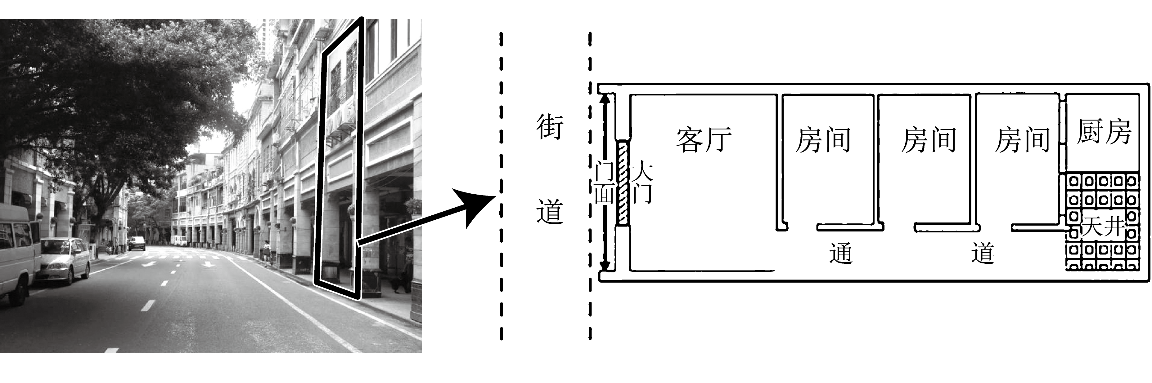 19世纪上半叶,广州工商业快速发展,城市人口急剧增长,门面窄小、平面结构纵深狭长的竹筒屋应运而生。近年来,当地政府对部分竹筒屋进行规划和改造。图左为竹筒屋景观图,图右为竹筒屋一楼平面结构示意图。完成下面小题。
