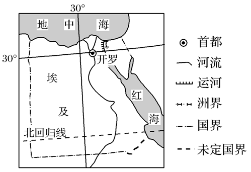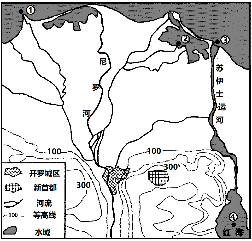 埃及沙漠广布,人口、城市主要集中在尼罗河谷地和三角洲,首都开罗是埃及政治、经济、文化中心。从20世纪60年代以来,开罗人口已经从350万增长到2000多万,其中1100万人住在违章建筑中,这里也没有给排水设施。2021年12月,埃及政府宣布在开罗以东约45公里处的沙漠地区兴建新首都。新首都作为政治中心,规划容纳500万居民,提供175万个长期工作职位。左下图为埃及略图,右下图是尼罗河三角洲附近地形图。据此完成下面小题。