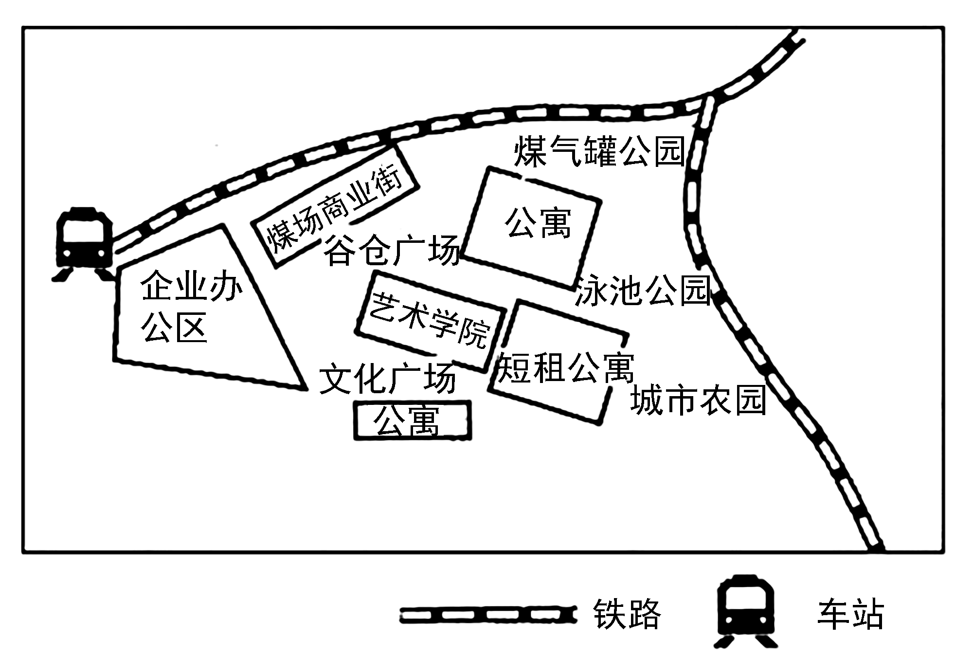 19世纪中期,煤气厂、油漆制造厂等多家工业企业和仓储物流园入驻伦敦城北某街区。20世纪中叶以后,公路地位上升,该街区产业逐渐衰败。目前,该街区转型发展第三产业,进行工业遗产的改造。管理部门并未将全部工业遗产改造升级,而是将部分仓库、堆场等空地简易改造成广场,不定期举办各类时尚展览。下图示意该街区目前的空间形态。据此完成下面小题。