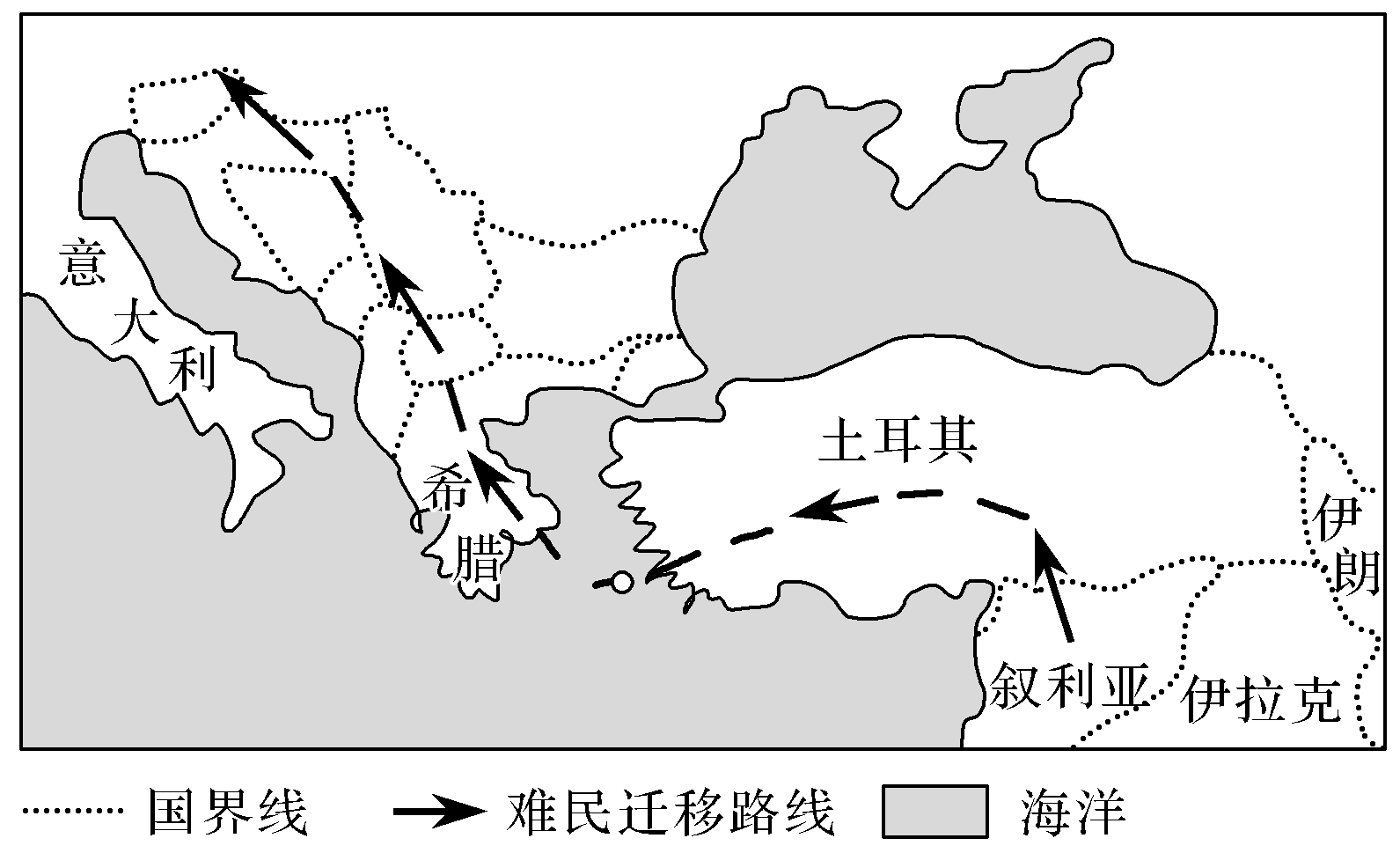 叙利亚多年内战造成了人数巨大的难民群体,大多数的难民涌向欧洲,引发欧洲难民危机。下图为叙利亚难民迁移路径图。据此完成下面小题。