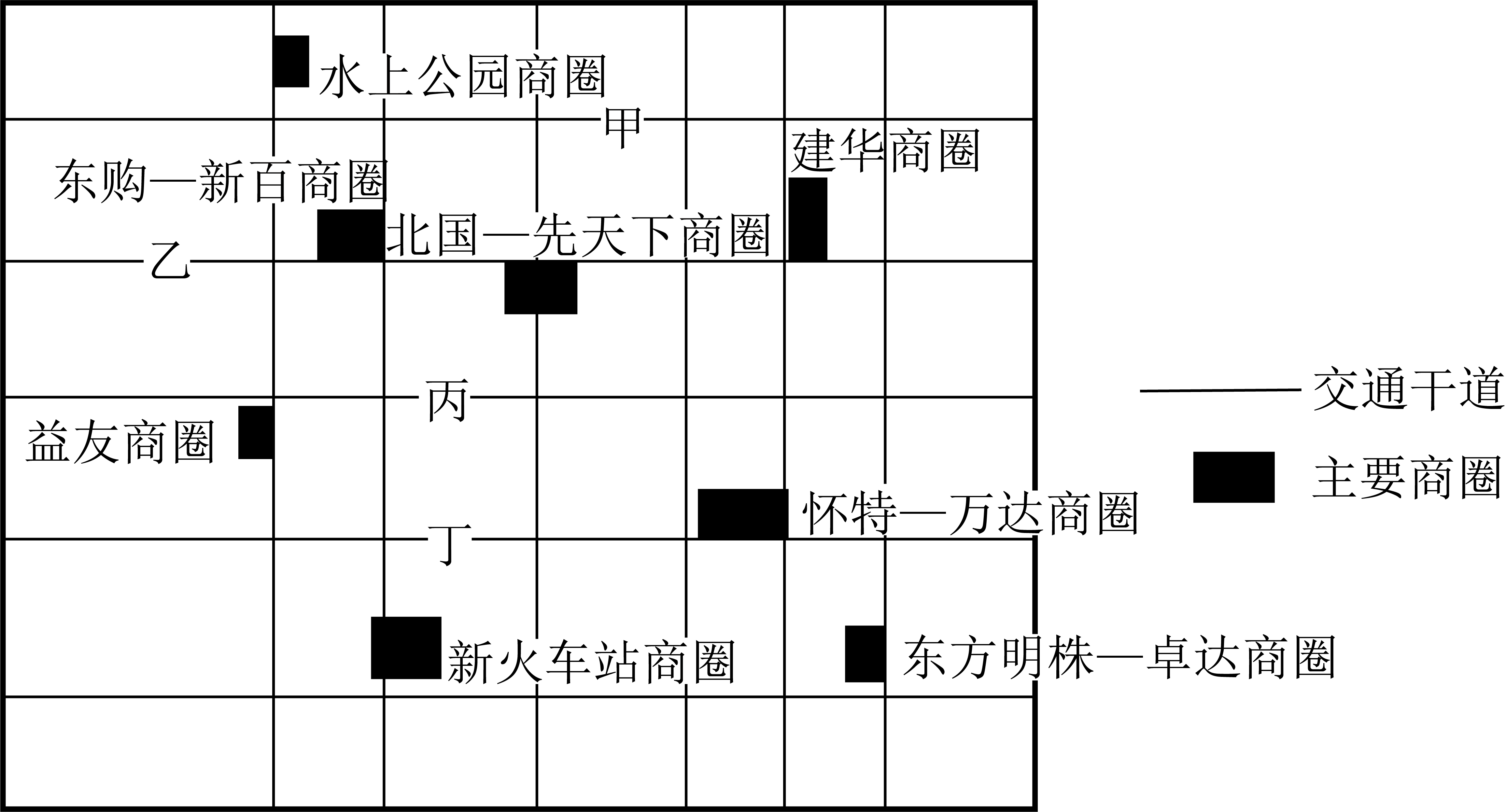 目前,河北省省会石家庄已开业的大型商场数量较多,以大型高档、中高档商场、中档商场为中心的区域,形成规模不等的商业圈。下图为石家庄主要商圈分布图(黑块越大,则表示商圈规模越大)。据此完成下面小题。