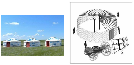 蒙古包能满足游牧需求,尤其能够对抗草原上严峻的自然灾害,是游牧民族与自然和谐相处的绝妙体现。下图示意蒙古包景观(左图)及蒙古包搭建过程(右图)。