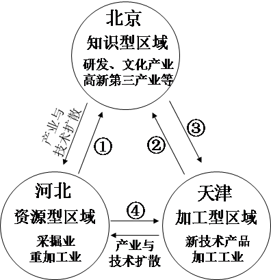京津冀地区位于环渤海地区的中心位置,是国家经济发展的重要引擎和参与国际竞争合作的先导区域,京津冀协同发展是重大国家战略。下图为京津冀产业特征及联系示意图。