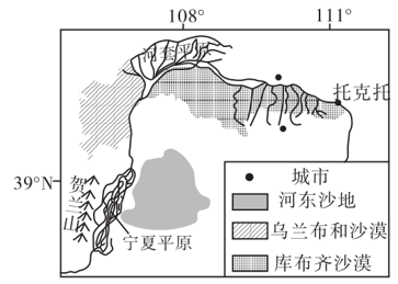 黄河上游自宁夏到内蒙古托克托先后流经河东沙地、乌兰布和沙漠、库布齐沙漠,流程大约1000公里(如下图所示)。由于沙漠的快速推进,黄河在该河段含沙量急剧升高。读图完成下面小题。