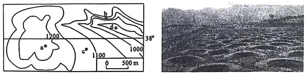 黄土高原是我国水土流失最严重区域之一。以小流域为单元,因地制宜进行水土保持工作,是治理水土流失的关键。在生物措施、耕作措施和工程措施的综合作用下,经过几十年的治理,林草覆盖率不断提高,黄土高原沟壑区农、林、牧业得到全面发展。下面左图示意黄土高原某小流域等高线分布,右图示意水土保持工程措施之一的鱼鳞坑。完成下面小题。