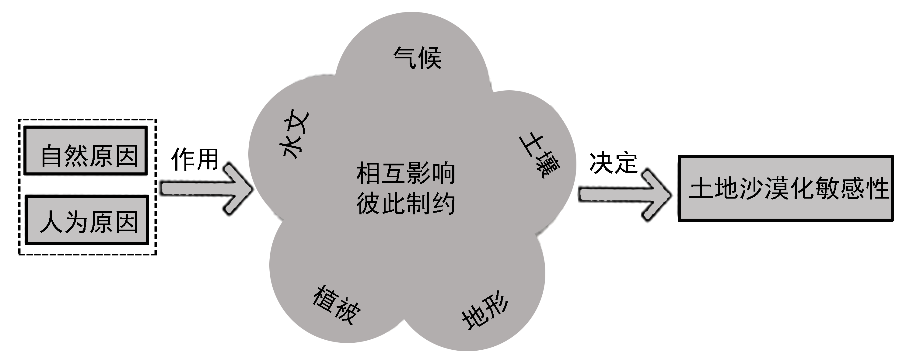 沙漠化是受气候变化、人类活动等因素的影响,发生在干旱、半干旱地区的一种土地退化现象。沙漠化敏感性是指受各种因素的影响与制约,导致土地发生沙化的可能性大小。研究表明,中国西北地区高敏感性的土地面积在2000~2017年间减少了大约4.78*104km2。下图为中国西北地区土地沙漠化敏感性原理解析。据此完成下面小题。