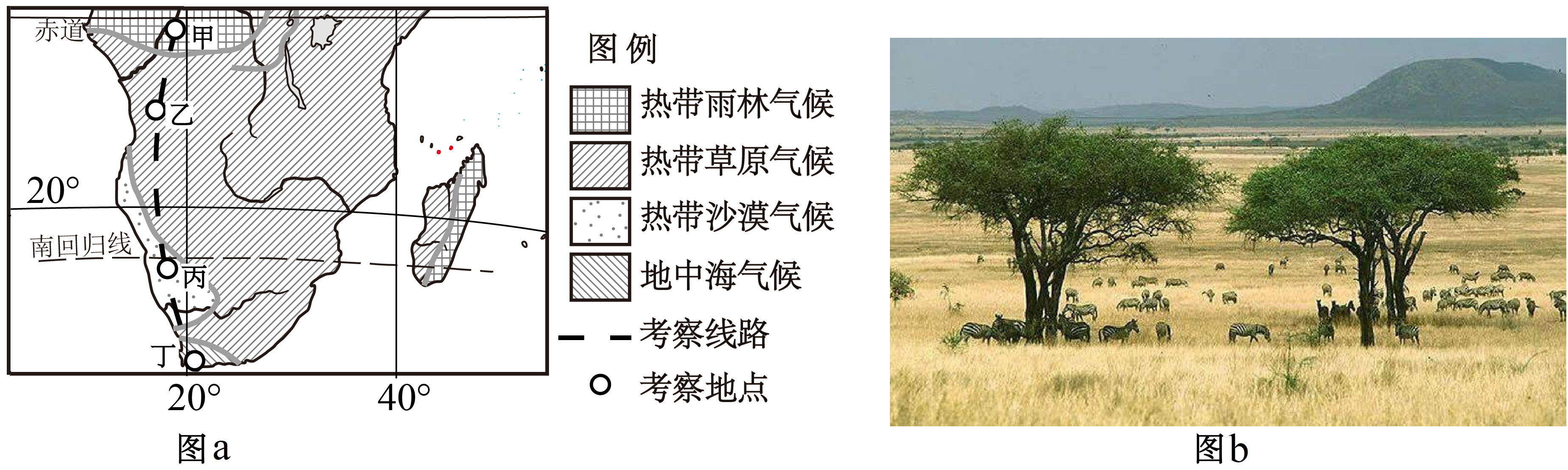 某地理研学小组计划在非洲南部开展一次野外考察。图a为该团队的活动线路,图b为某考察点典型自然植被景观图。完成下面小题。