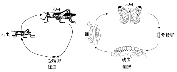 | B.蝗虫、蝴蝶的生殖过程均为无性生殖 |