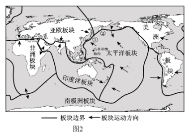 该展厅通过科技手段,模拟喜马拉雅山脉的形成,图2为全球板块分布图,图中①②③地为2024年中国地震台网监测到的世界超过6.0级地震的地区。