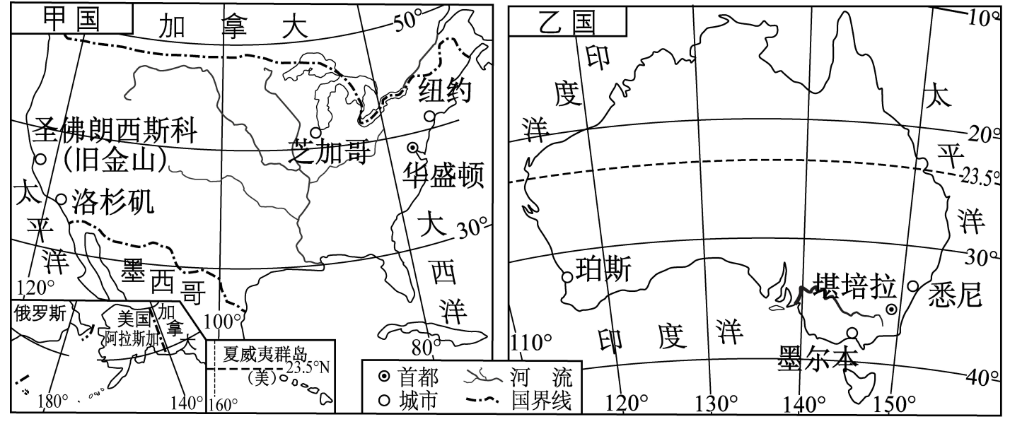 比较法是学习区域地理的重要方法。读甲、乙两国轮廓图,完成下面小题。