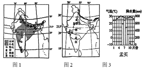 棉花喜光、喜温、耐旱,适宜生长在排水条件良好的地区,棉花在前期需要降水,收获季节雨量要小。孟买是印度最大的棉纺织工业中心,也是印度最大的海港和重要交通枢纽,素有印度“西部门户”之称。读图1印度主要农作物分布图、图2印度疆域图和图3孟买气候图,完成下面小题。