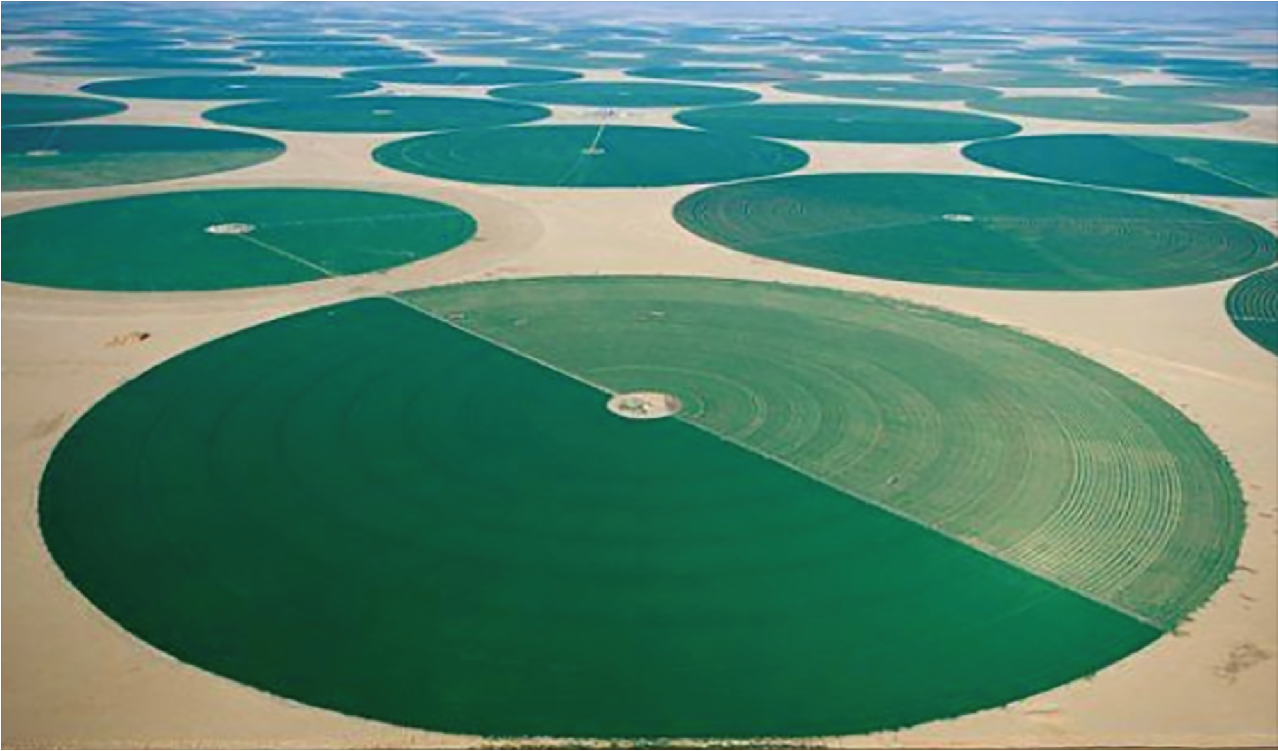 西亚大部分国家气候干旱,沙特阿拉伯为了种植农作物,在沙漠中抽取地下水,如图为沙特阿拉伯在沙漠里抽取地下水进行喷灌的圆形农田景观图。据此完成下面小题。