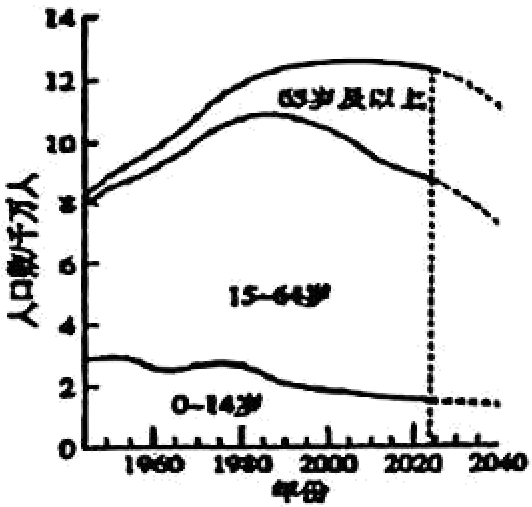 护理机器人是针对失能老人护理工作被研发出来的,日本是机器人出口和使用大国,日本经济产业部预计,2020-2030年日本护理机器人市场将扩大20倍。如图为日本人口年龄变化,据此完成下面小题。