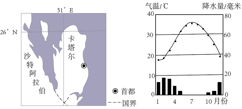 第22届世界杯足球赛将于2022年11月21日在卡塔尔开幕。图为卡塔尔位置示意图及多哈气候统计图。读图,完成下面小题。