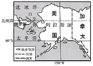 美国阿拉斯加深海中,生存着一种体型巨大、外表威武的帝王蟹。它身上覆盖着一层坚固如铠甲的外壳,是螃蟹界的王者,肉质鲜美。下图示意阿拉斯加位置。据此完成下面小题。